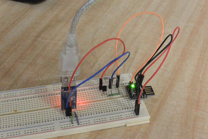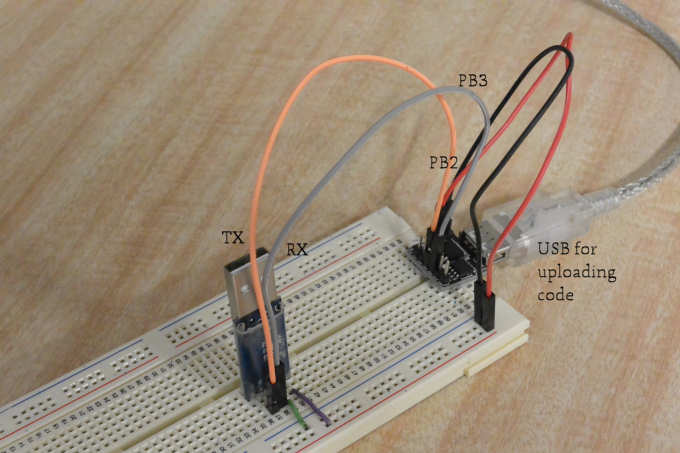As mentioned in the previous section, advantage of the digispark SoftSerial library is the ability to declare the same pin for TX and RX. This requires some code changes as shown in Code Snippet 3. Also, the RX and TX pins of the USB-TTL converter need to be tied together (linked). This "loop back" of the USB-TTL converter pins means that any data (character string etc) received at the ATtiny85 pin will be immediately "echoed" back to the USB-TTL.