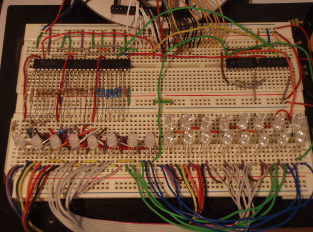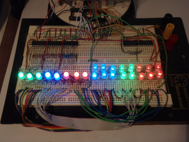 Therefore, in order to light a particular RGB LED for a particular colour, the correct bit within the fourth shift register needs to be set to select the correct cathode (i.e. connect the row to ground) and then the correct bits within the first three shift registers need to be set to select which anodes are connected to Vcc, and hence light the appropriate LED. This highlights a couple of other features of the circuit: