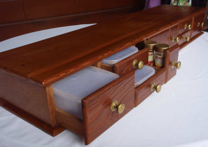 Typically, spices are sold in small glass bottles and spice racks usually are designed to accomodate such standard products. In addition to spices, there is also a need to store 'powders' such as flour, salt, sugar and other such ingredients. These more 'bulk' materials are typically stored in 'canister sets'. Since we bake our own bread, there was a need to have such ingredients readily available. So the combination of a spice rack and canister set would be convenient for the kitchen bench top, something like an apothecary cabinet.