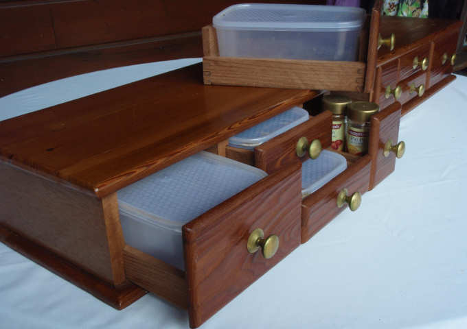 However, the draws of an apothecary cabinet are not particularly resistent to stopping insects or protecting contents from humidity etc. The best protection for cooking ingredients is the ubiquitious plastic container. But such plastic containers are not particularly attractive and need to stored in any case. This lead to the idea to design an 'apothecary cabinet' that would look attractive in the kitchen, yet the internals would use standard re-sealable plastic containers to protect the contents being stored.