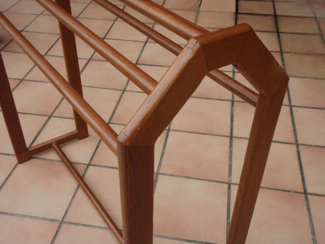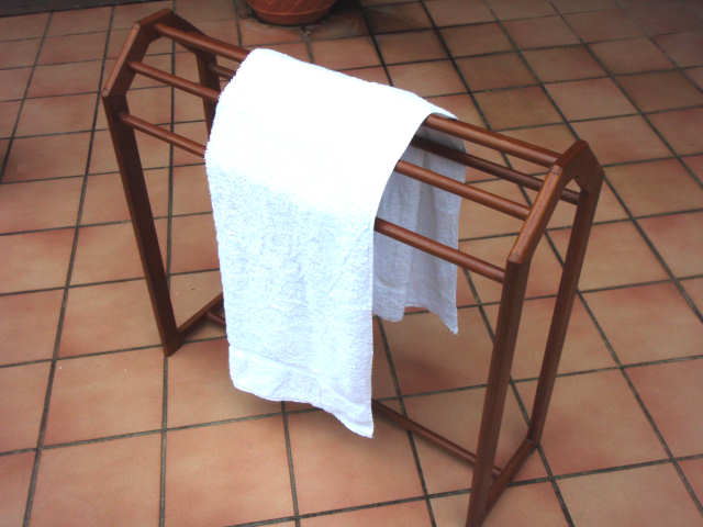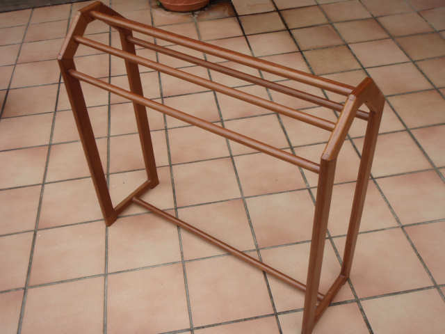 The towel rack is constructed from 20mm diameter dowels, 1m in length. The frames to hold the dowels can be made from any suitable light weight material.