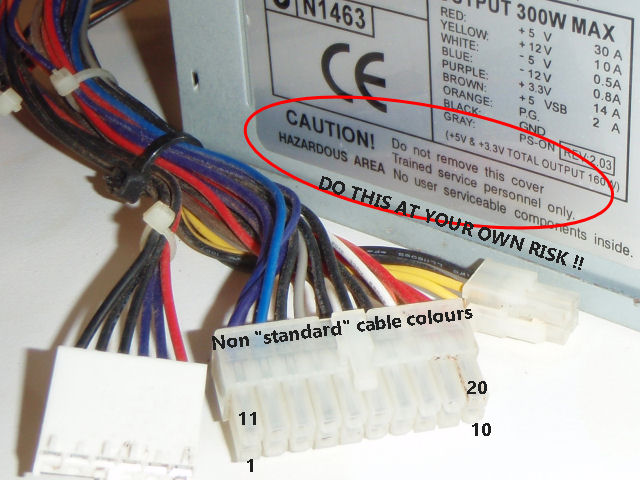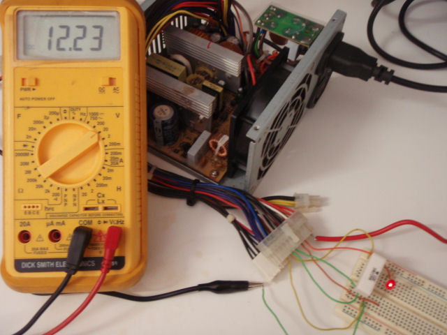 The ATX supply cannot be just plugged into the mains supply to produce the various output voltages. This is because these PC power supply units have two safety mechanisms that prevent the ATX supply operating without the PC motherboard being attached (8). Firstly, the ATX supply requires a “Power-ON” zero voltage signal to start up similar to the “ON-OFF” switch on the front of a PC. Secondly, for the ATX supply to correctly regulate the +5V output voltage it needs to have some sort of load attached, at least 5W to trick the ATX supply into thinking its attached to the motherboard.