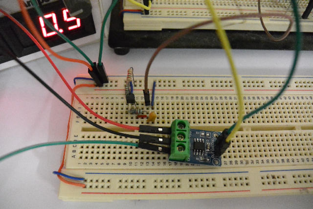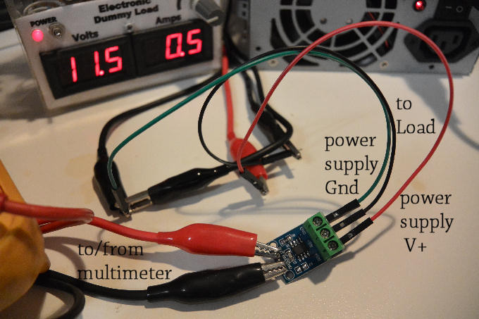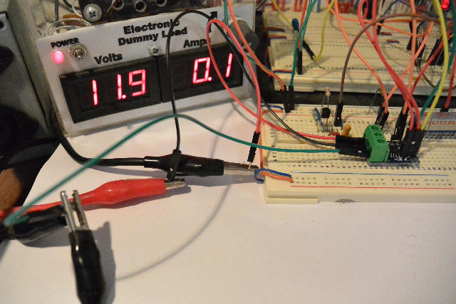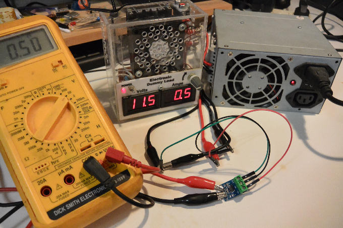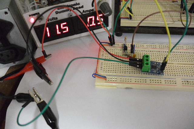 Testing of the MAX471 breakout board consisted of a number of stages. Initially, dummy loads where connected to produce currents of known magnitude with the output of the MAX471 Vout pin monitored with a digital multimeter. I have a DIY electronic dummy load which made applying known currents easy. If this is not available, simply use a suitable load resistor (and varying the applied voltage and or resistor value to develop the desired current value).